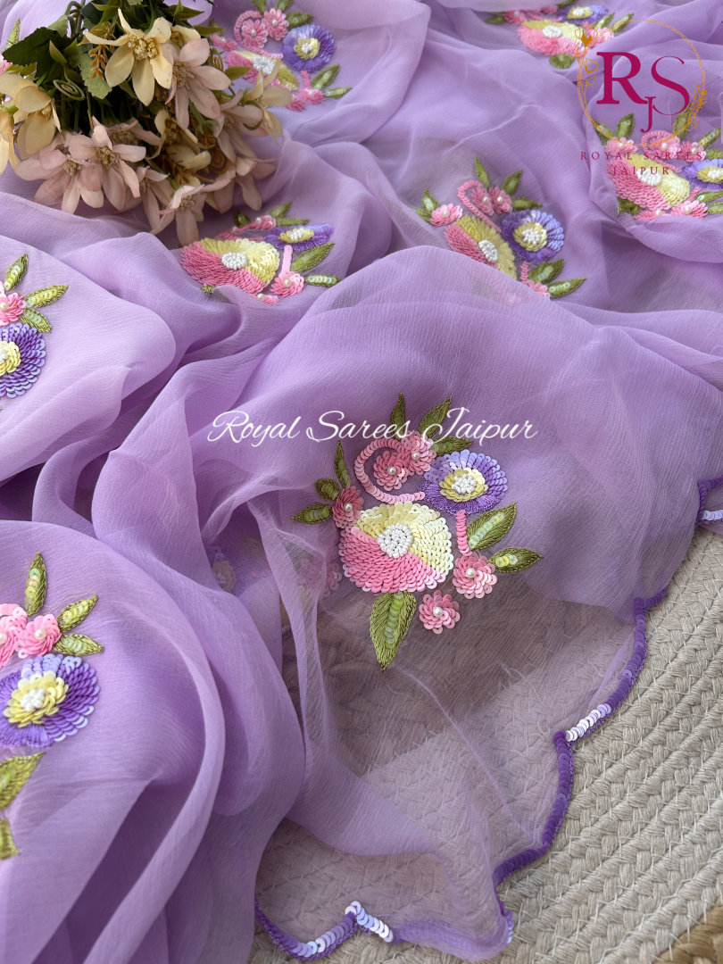 The saree is beautifully embellished with hand-embroidered floral motifs, thoughtfully crafted using shimmering sequins and intricate threadwork. Soft pastel shades of lilac, blush pink, butter yellow, and fresh green come together harmoniously to form delicate blossoms and foliage, adding depth and gentle sparkle without overpowering the fabric’s natural grace. Each motif is meticulously embroidered by skilled artisans, reflecting fine craftsmanship and attention to detail.