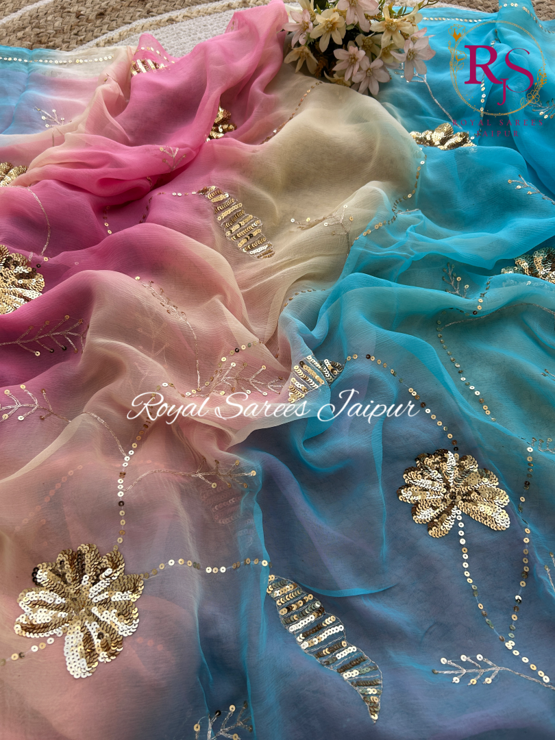 Experience soft sophistication with this pastel diamond chiffon saree, gracefully blending hues of blush pink, ivory, and aqua blue. Adorned with delicately hand-embroidered golden sequin floral and leaf motifs And Jaal work, the saree offers a subtle shimmer that enhances its dreamy appeal. The lightweight, flowy chiffon drape ensures effortless elegance, making it an ideal choice for daytime festivities, destination weddings, and refined evening occasions.