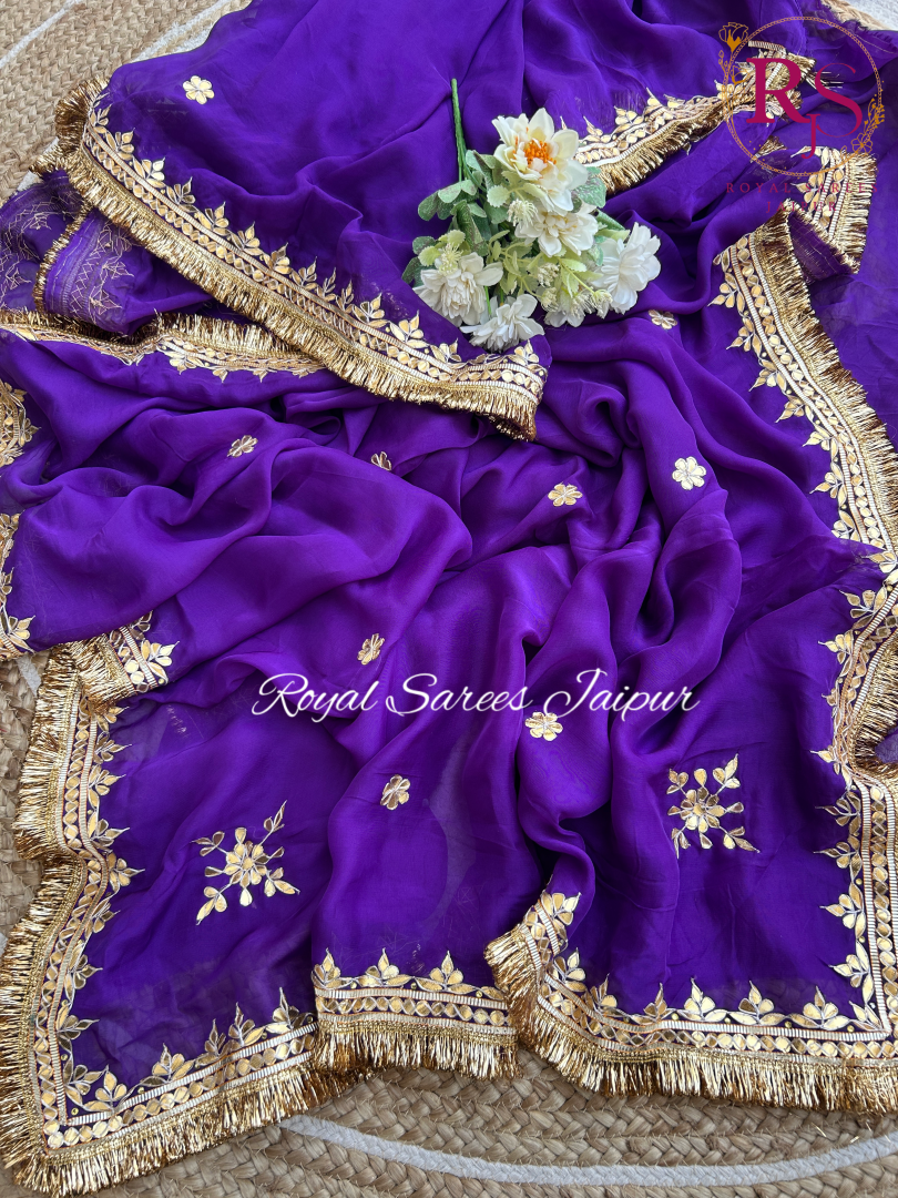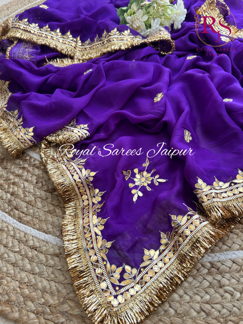 A majestic purple organza saree exquisitely embellished with handcrafted gota patti floral motifs and an opulent fringed border, embodying royal elegance and festive grandeur.